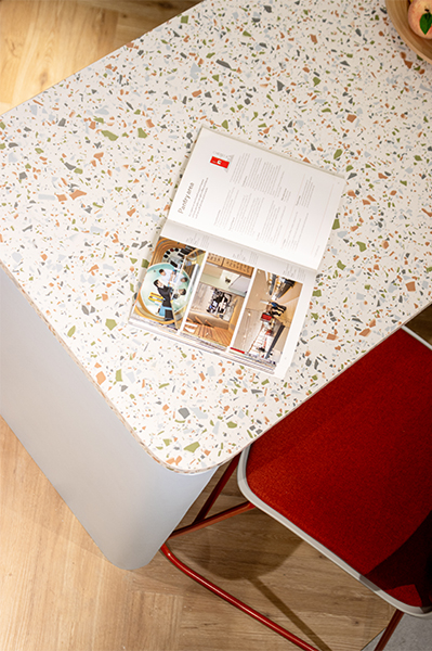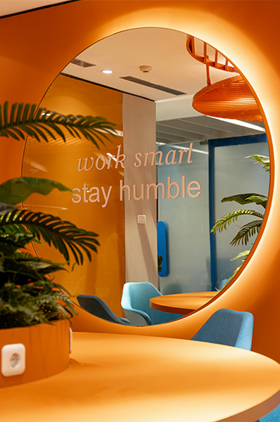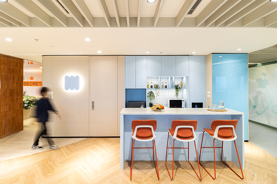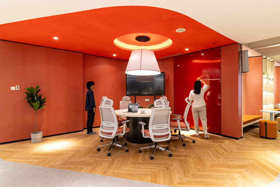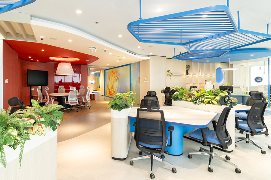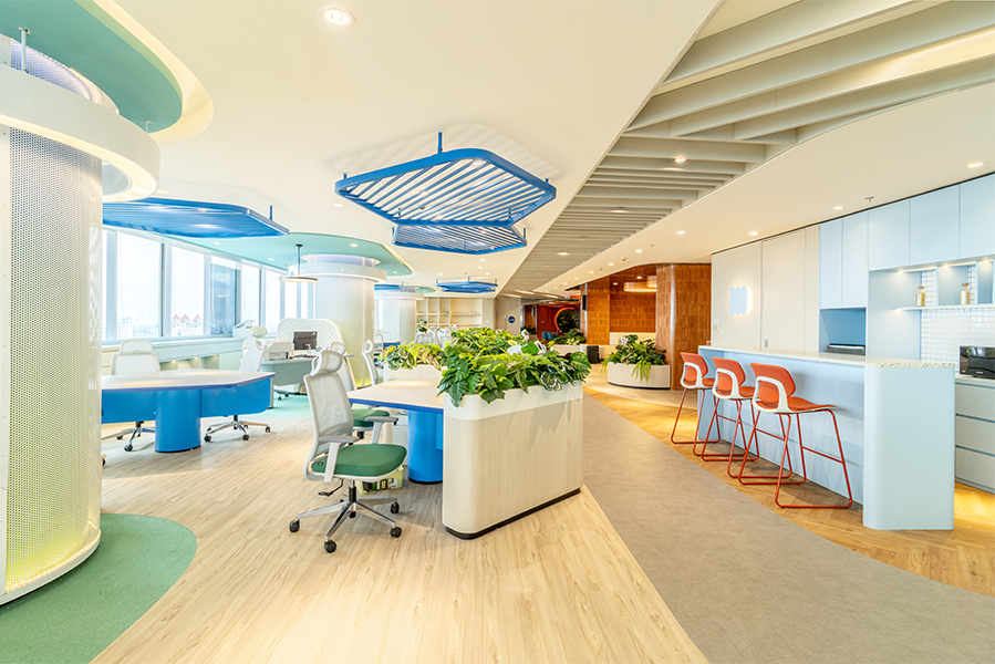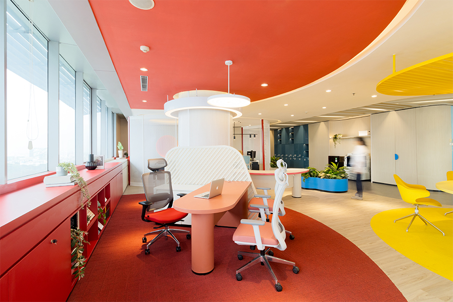 A palette of vibrant colors is introduced to stimulate energy and enhance work enthusiasm, balanced with the warmth of light wood finishes that bring a sense of harmony and natural comfort within the overall dynamic composition.