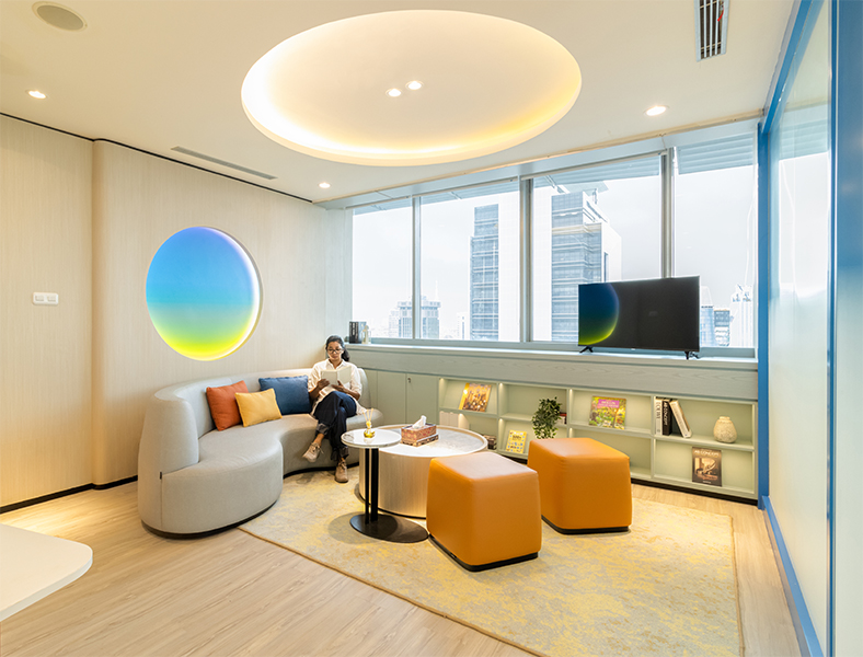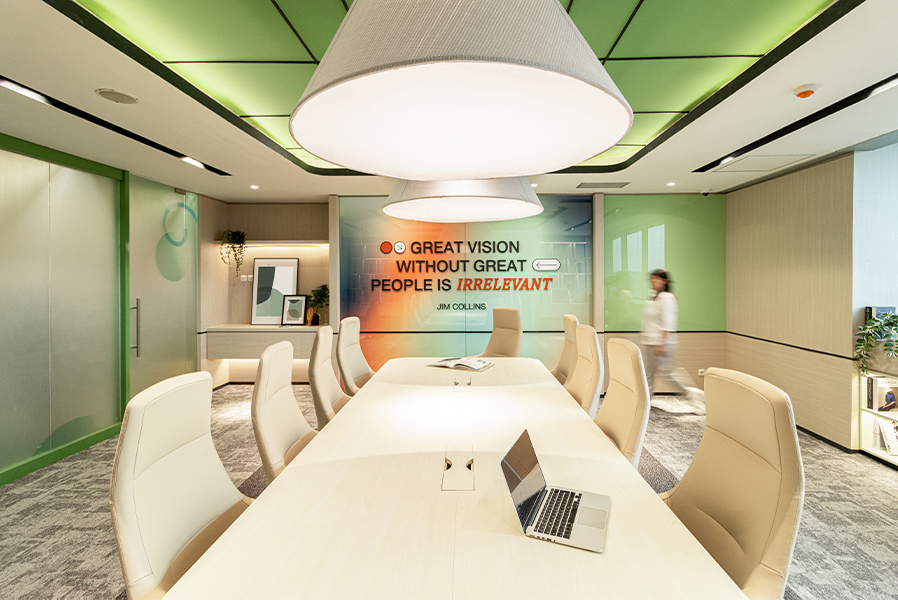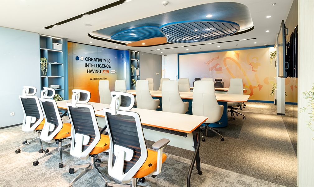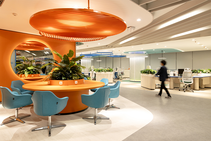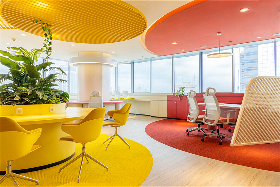 A palette of vibrant colors is introduced to stimulate energy and enhance work enthusiasm, balanced with the warmth of light wood finishes that bring a sense of harmony and natural comfort within the overall dynamic composition.