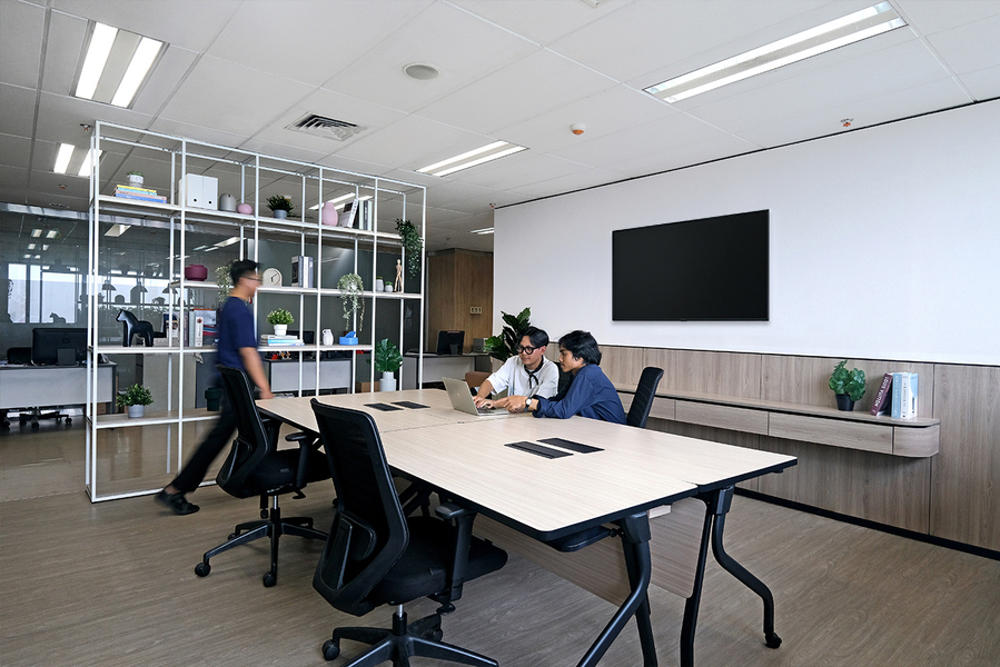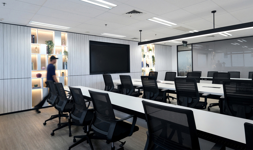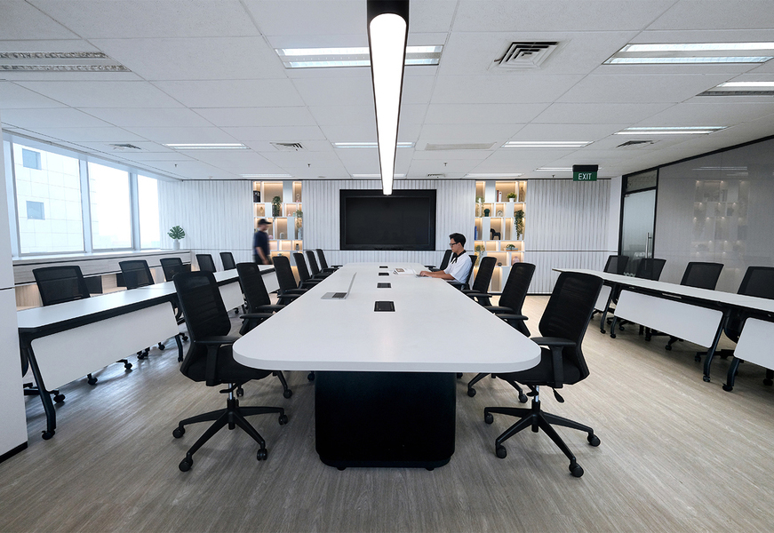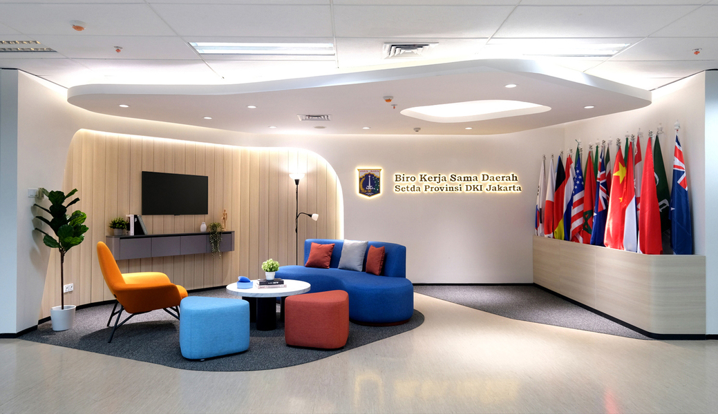 At Kantor Biro Kerja Sama Daerah Setda Provinsi DKI Jakarta, the interior design fosters a professional, open, and inviting atmosphere. With dynamic forms and warm ambient lighting, the lobby exudes a relaxed and yet still maintain its professional vibe, complemented by a row of international flags that highlight the office’s regional and global collaborations. Designed with functionality in mind, the meeting room features a bold monochromatic palette, reinforcing a strong, professional presence. Additionally, the ergonomic coworking area is tailored to encourage staff engagement, collaboration, and productivity.